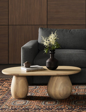 Refresh your space with an organic coffee table design. Chunky tulip legs bring a sculptural tone with crisp impact to this wood coffee table while the oval top offers a soft edge with a spacious surface for drinks and decor.