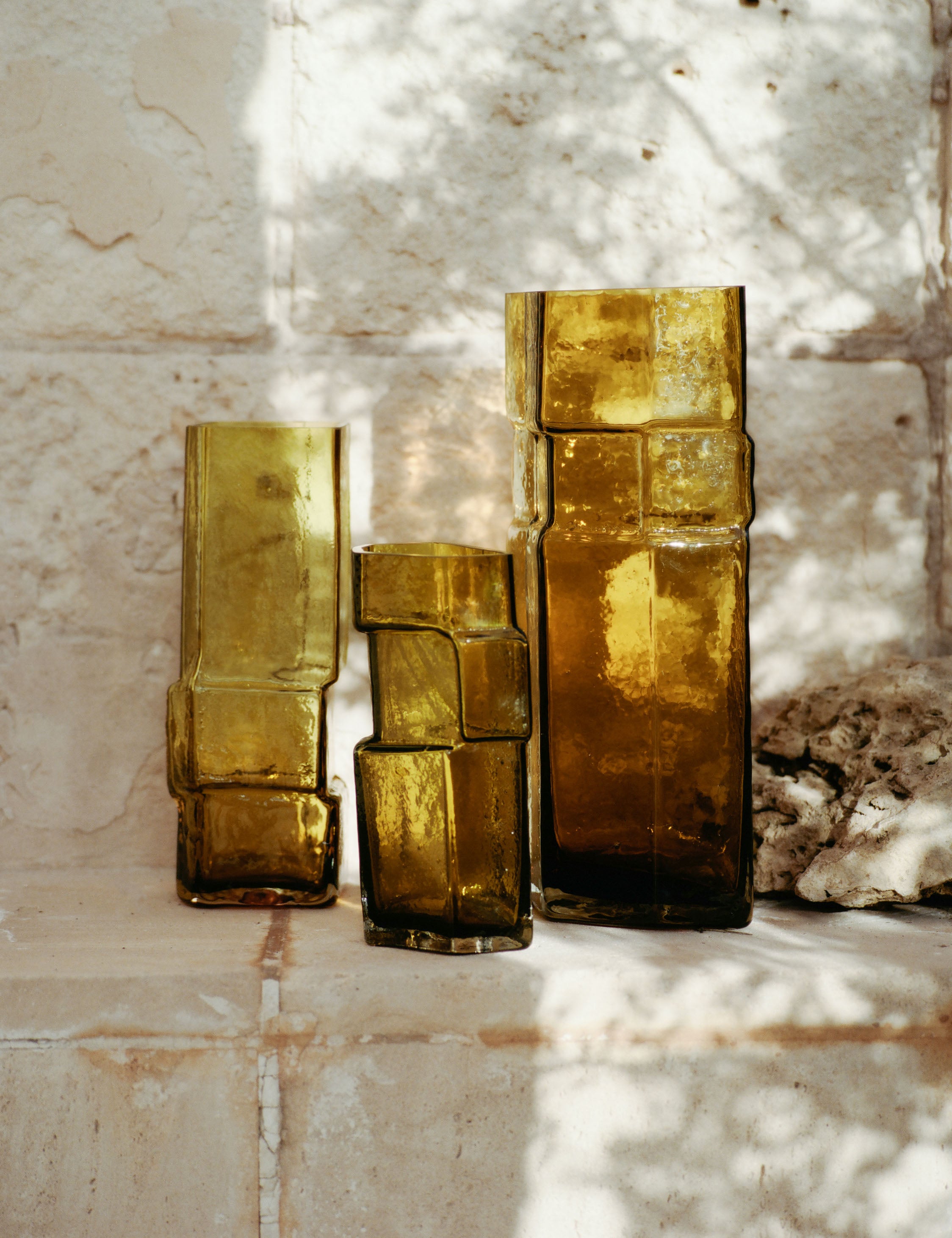 Shaped using molds cast from real bricks, the Muro vase brings an architectural dimension to your decor. Each piece is mouth-blown from recycled glass, offering rich texture and organic variation that feels collected and refined.