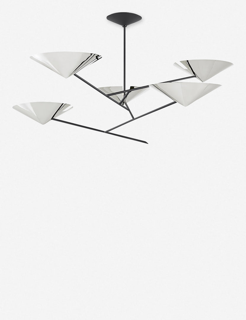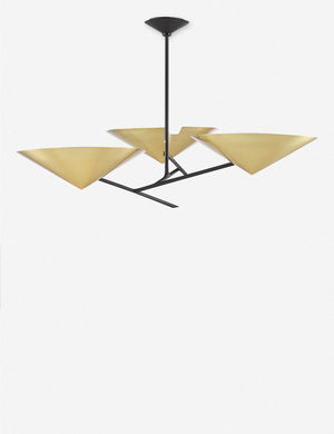 Give your space a harmonious glow with the addition of this stunning chandelier. Drawing from Eastern influence, three round, metal shades diffuse light upwards, with a cutout design to show off the chic, intersecting hardware.