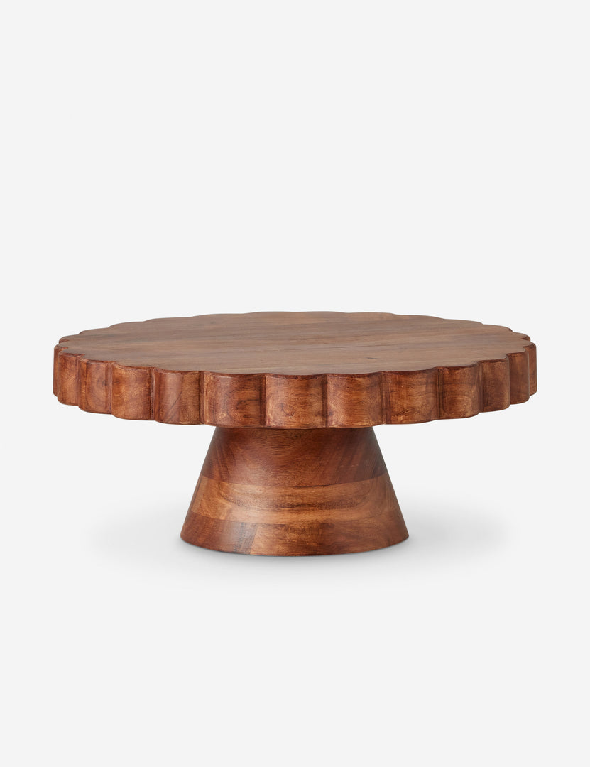 A scalloped edge and warm wood grain give this cake stand its balance of whimsy and refinement. Use it to serve pastries or pair it with a glass cloche for a striking centerpiece.