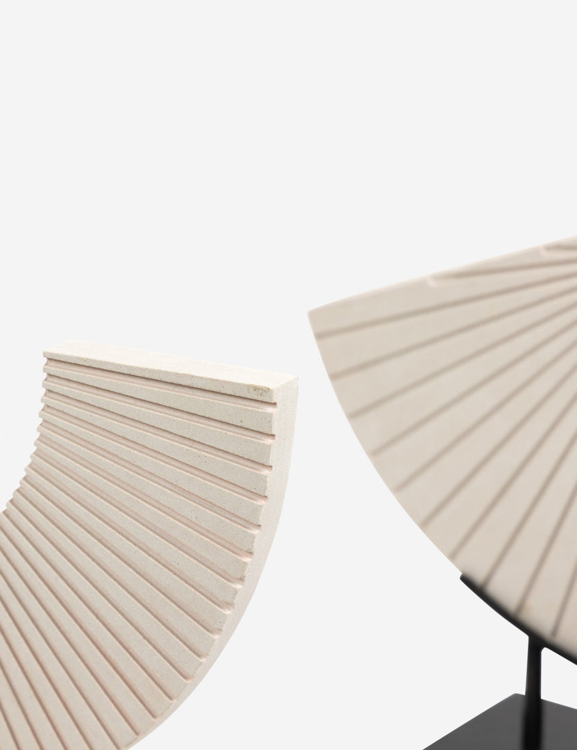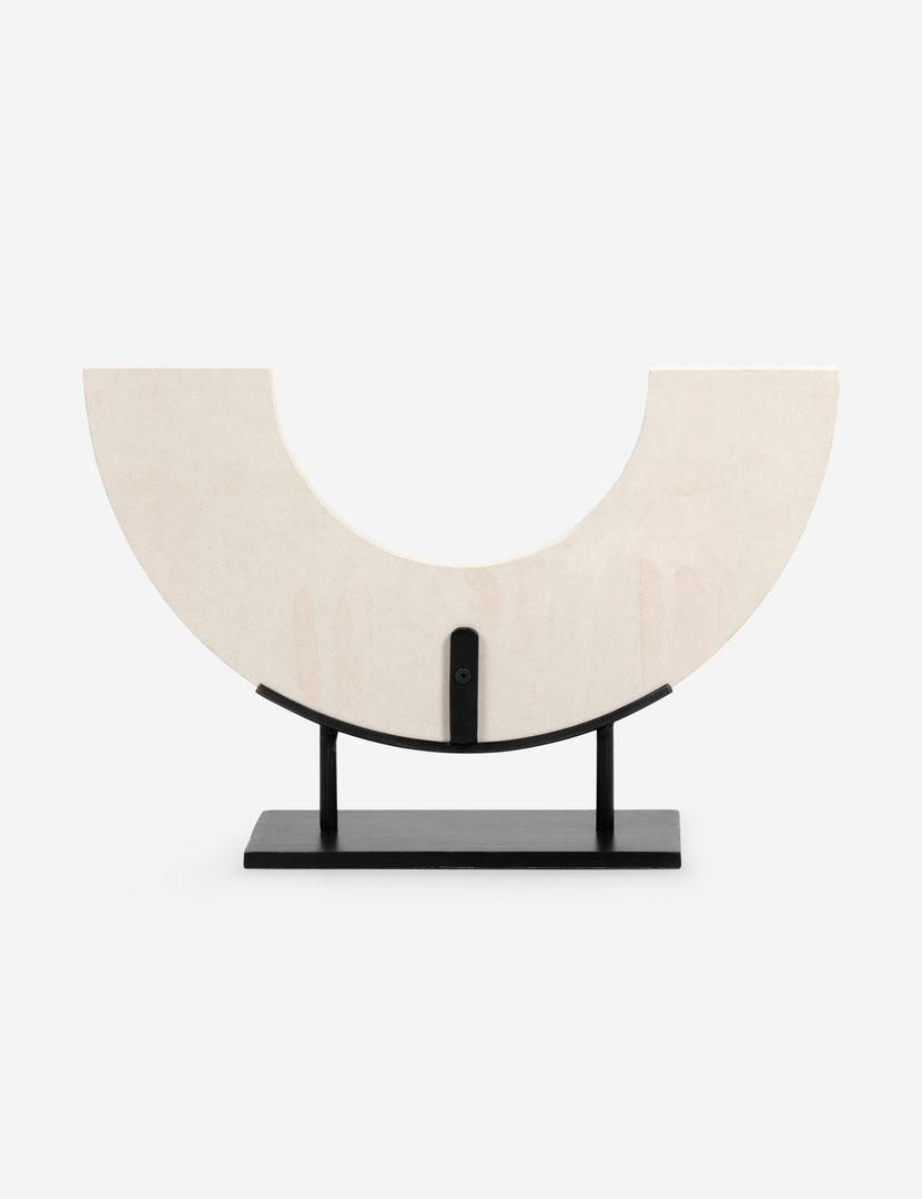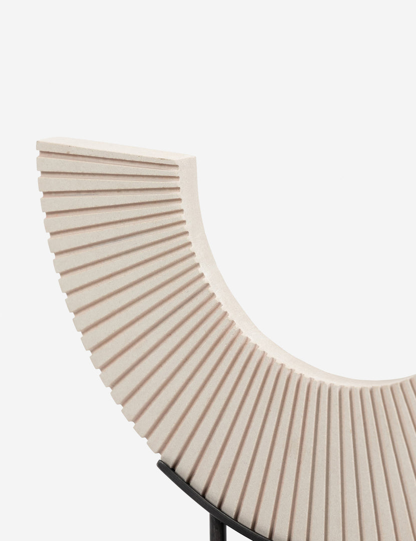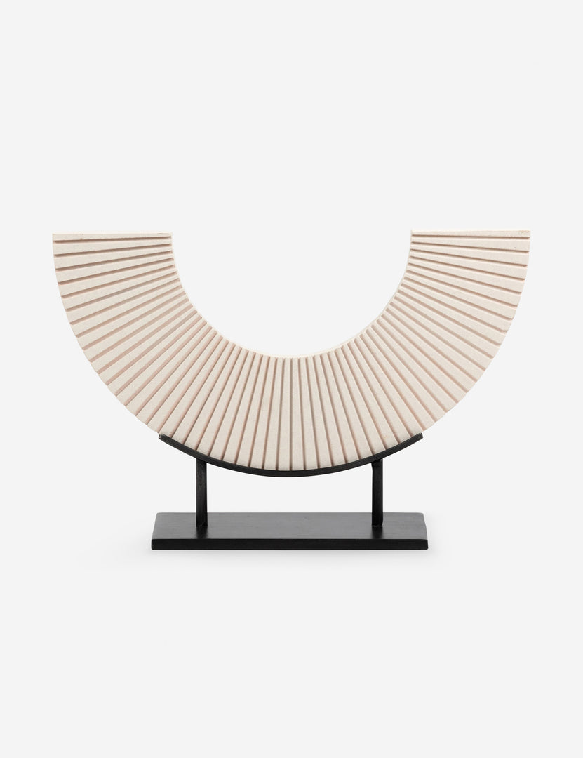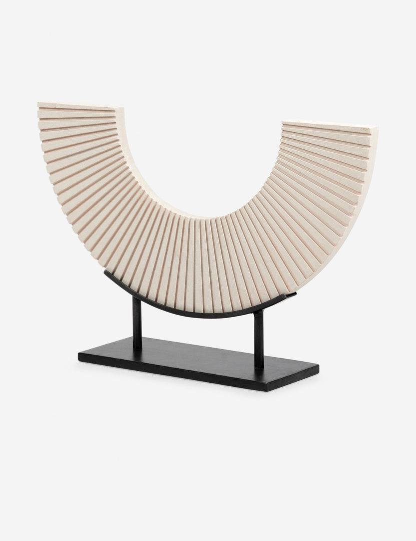 Earthy minimalism sets the tone in this sculptural object. The stone arc features a scored texture fanned across its face to offer grounded appeal with deco undertones. A sleek iron base makes for a striking presentation on your bookshelf or console.