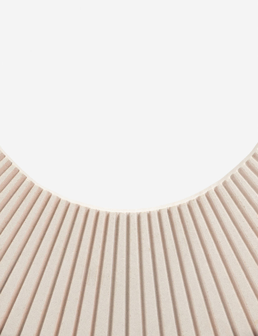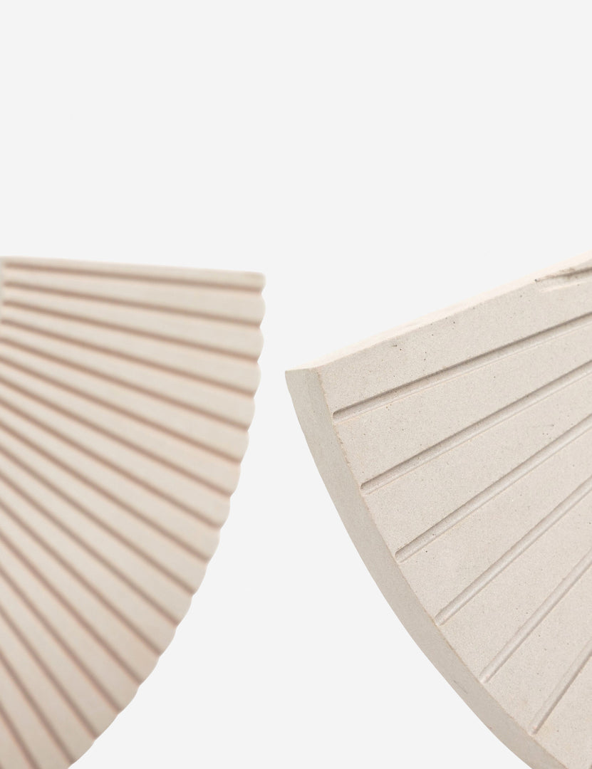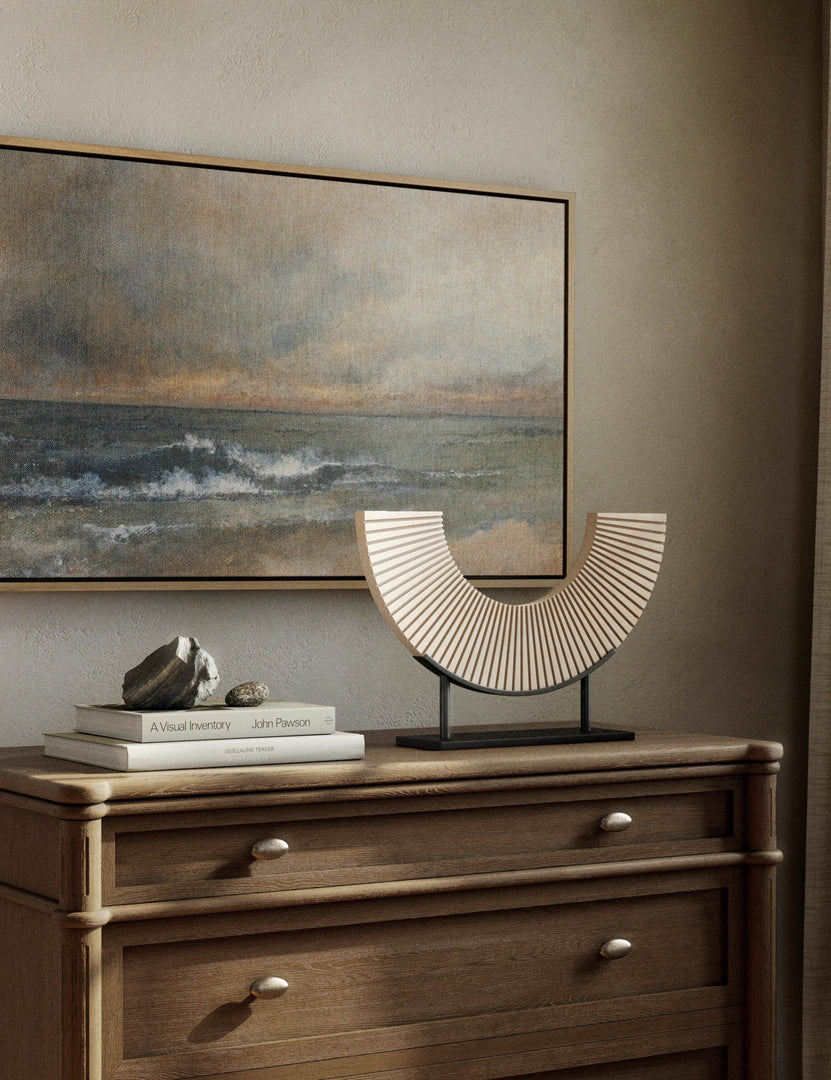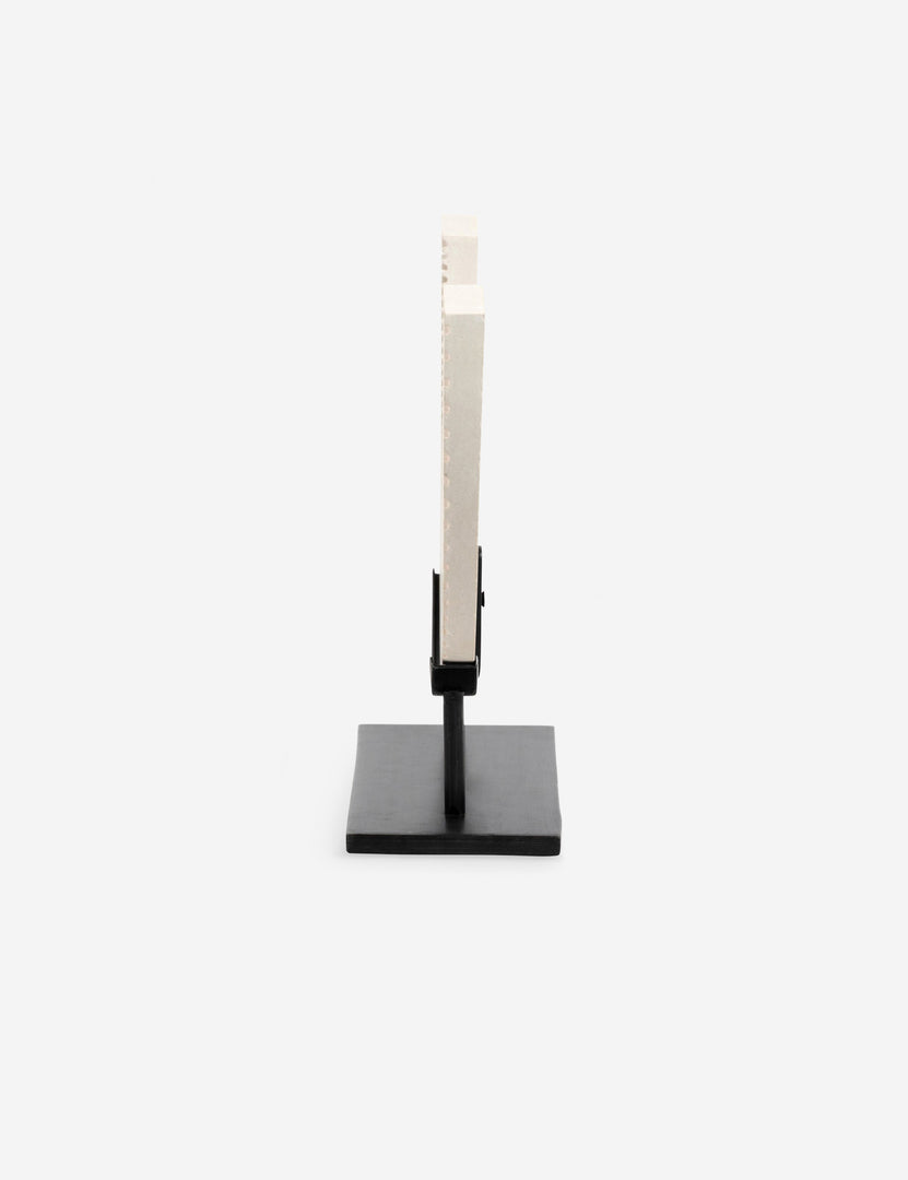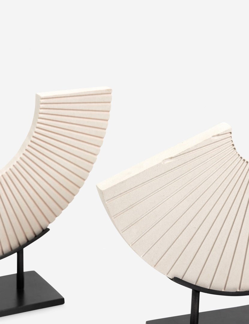 Earthy minimalism sets the tone in this sculptural object. The stone arc features a scored texture fanned across its face to offer grounded appeal with deco undertones. A sleek iron base makes for a striking presentation on your bookshelf or console.