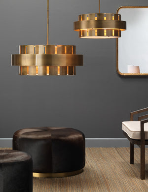 The Nicasio chandelier strikes a balance between industrial edge and refined design. A clean-lined acrylic diffuser offers soft, ambient light from the tailored silhouette, finished in antique brass. Hang it in your living room or over a round dining table for a modern chandelier with a warm and timeless feel.