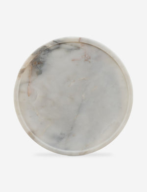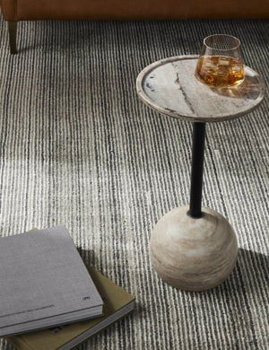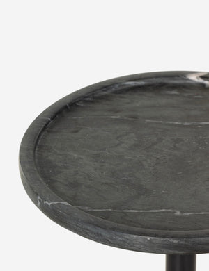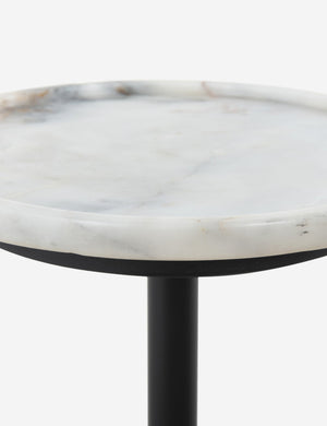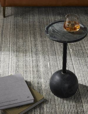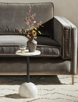 Poised for elegance, the Nicholas side table brings a touch of polish to any space. A marble orb holds an iron post, bolstering the round tray top in this sturdy end table design, offering sophistication with a practical touch.