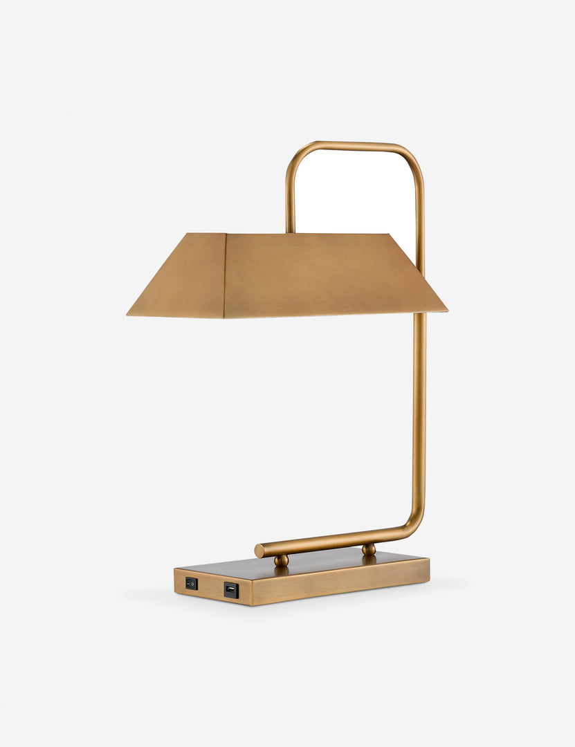 A sleek, angular design strikes a modern edge in the Noam desk lamp. The antique brass finish highlights its geometric form, setting the tone for a stylish tabletop task light. A USB port in the base adds a functional touch that is perfect for your home office or workspace.
