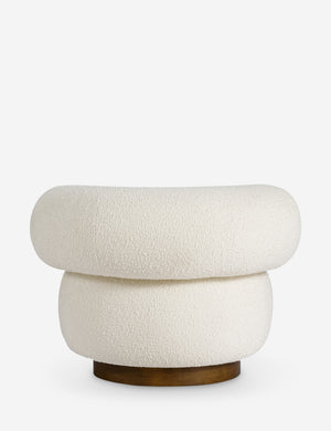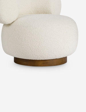 The Ohara chair invites chic comfort with its soft lines and boucle upholstery. This swivel chair sits on a sleek wood base that lifts the profile and adds a stylish edge. The dynamic design makes it perfect for a conversational lounge or window nook.