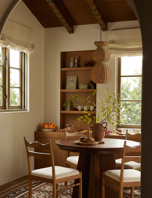 The Olivera pendant light pairs rich texture with a fluid silhouette for sculptural warmth. This wicker pendant makes a striking statement overhead with its intricately woven sinuous form.