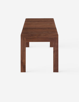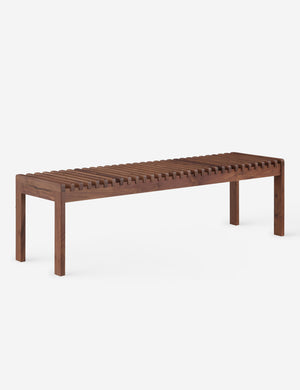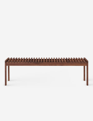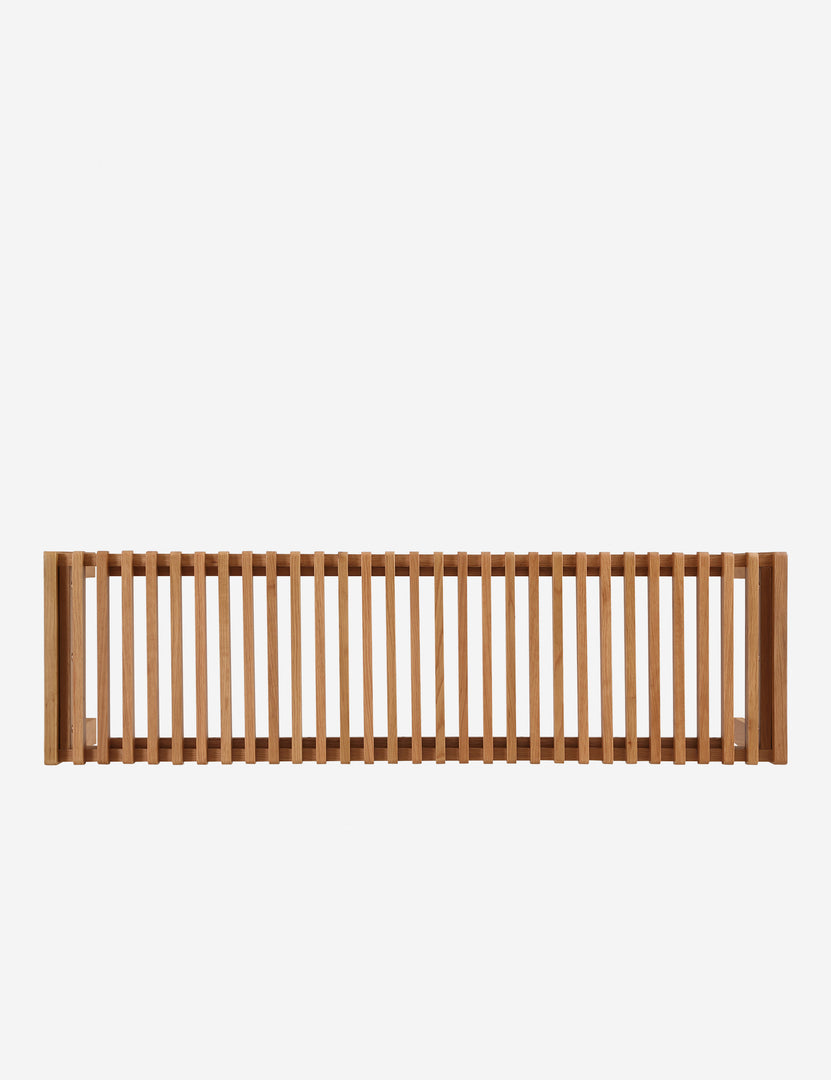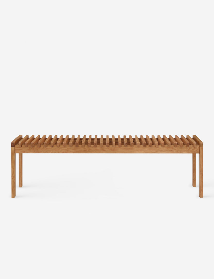 Bring some natural grain warmth to the room with this versatile bench. The solid wood construction offers a sturdy frame with space for seating or decor while the slatted bench seat strikes an airy, streamlined look full of mid-century charm.
