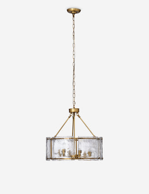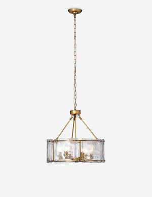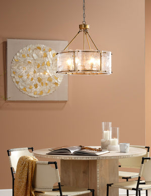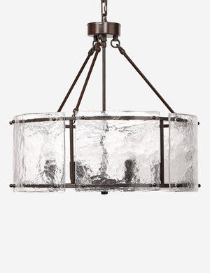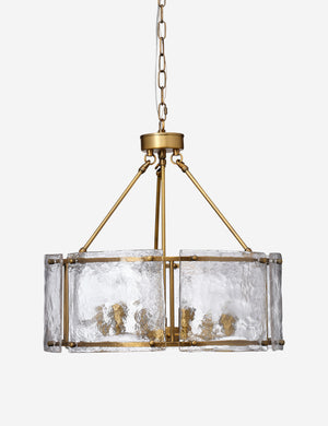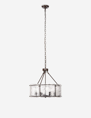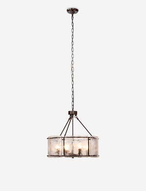 The Oncina chandelier balances industrial structure with artisanal texture. The rippled glass panels diffuse light with soft depth that plays beautifully against the burnished frame. Hang this modern chandelier above a dining table or in an entryway to add a timeless edge to the space.