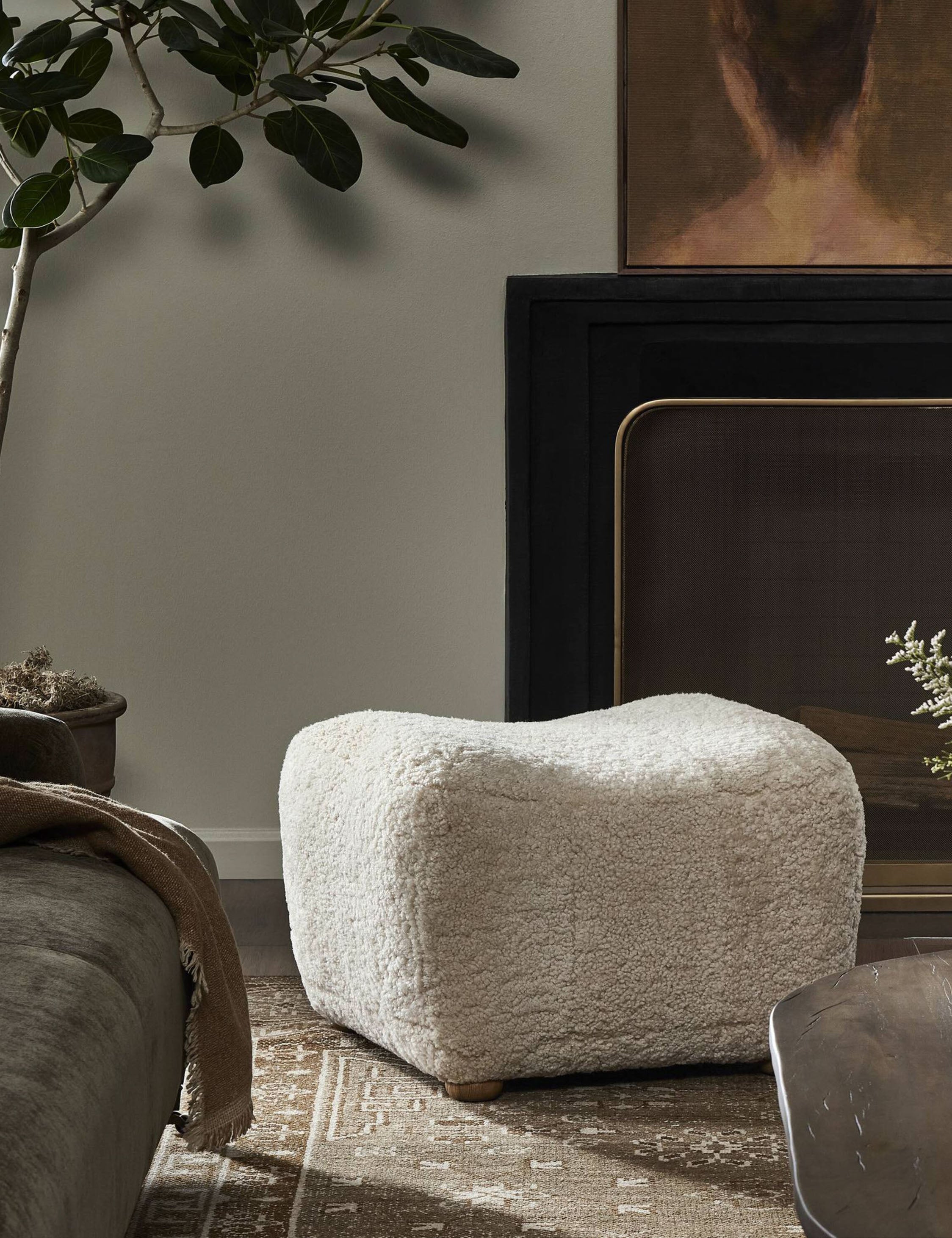 Four Hands brings their exceptional craftsmanship to a timeless collection rooted in Amber Lewis' perennial California style. Plush, inviting shearling upholstery accentuates graceful curves in this modern ottoman. It makes an excellent footstool or extra seat in your den or living area, with bun feet that add a touch of retro charm.
