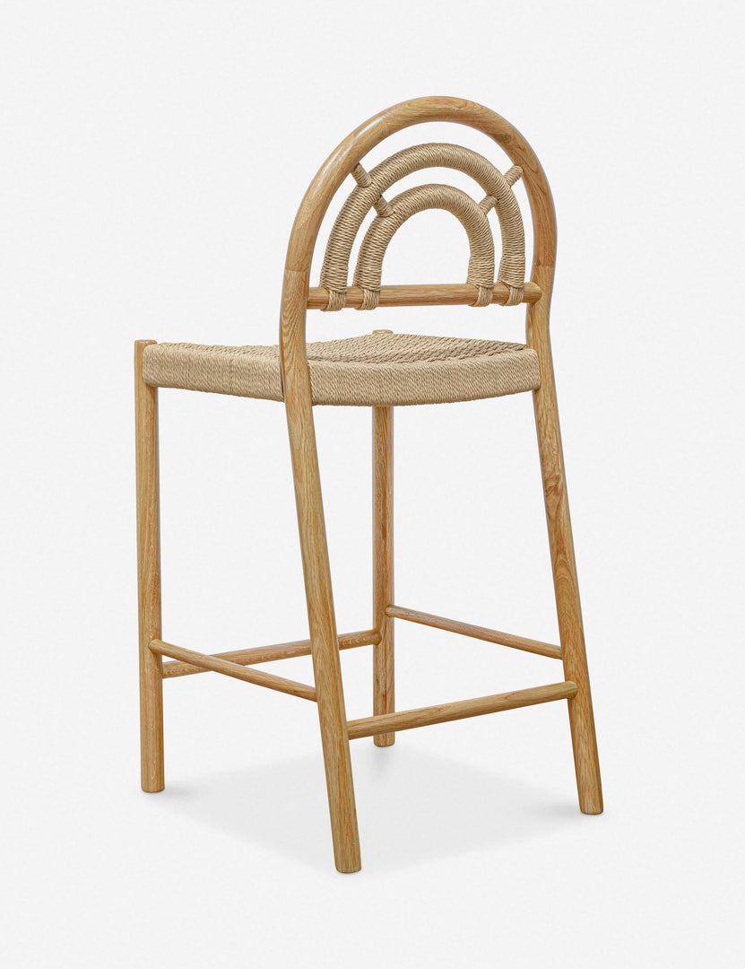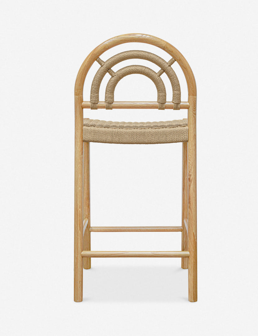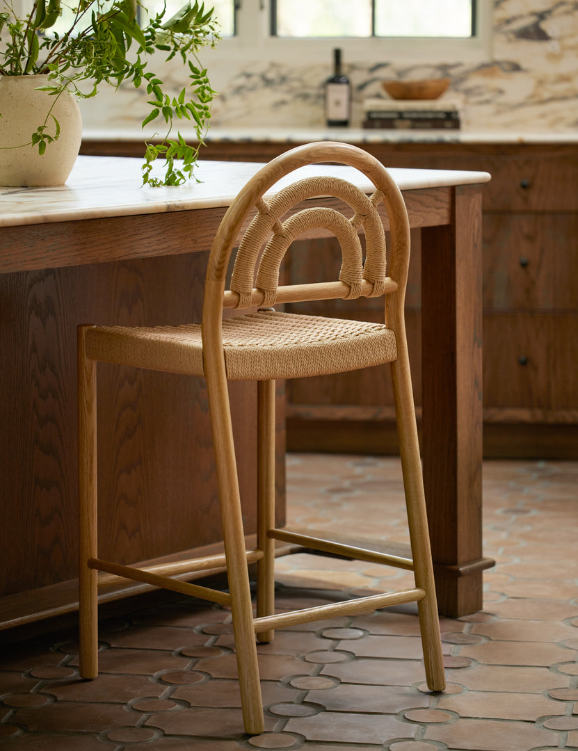 We love the nested arch backrest featured on this set of counter stools and think it's the perfect addition to a modern yet grounded kitchen island or counter-height table. Cane-wrapped details and a woven seat add texture and depth to the solid oak wood frame, imparting warmth with a casual touch.