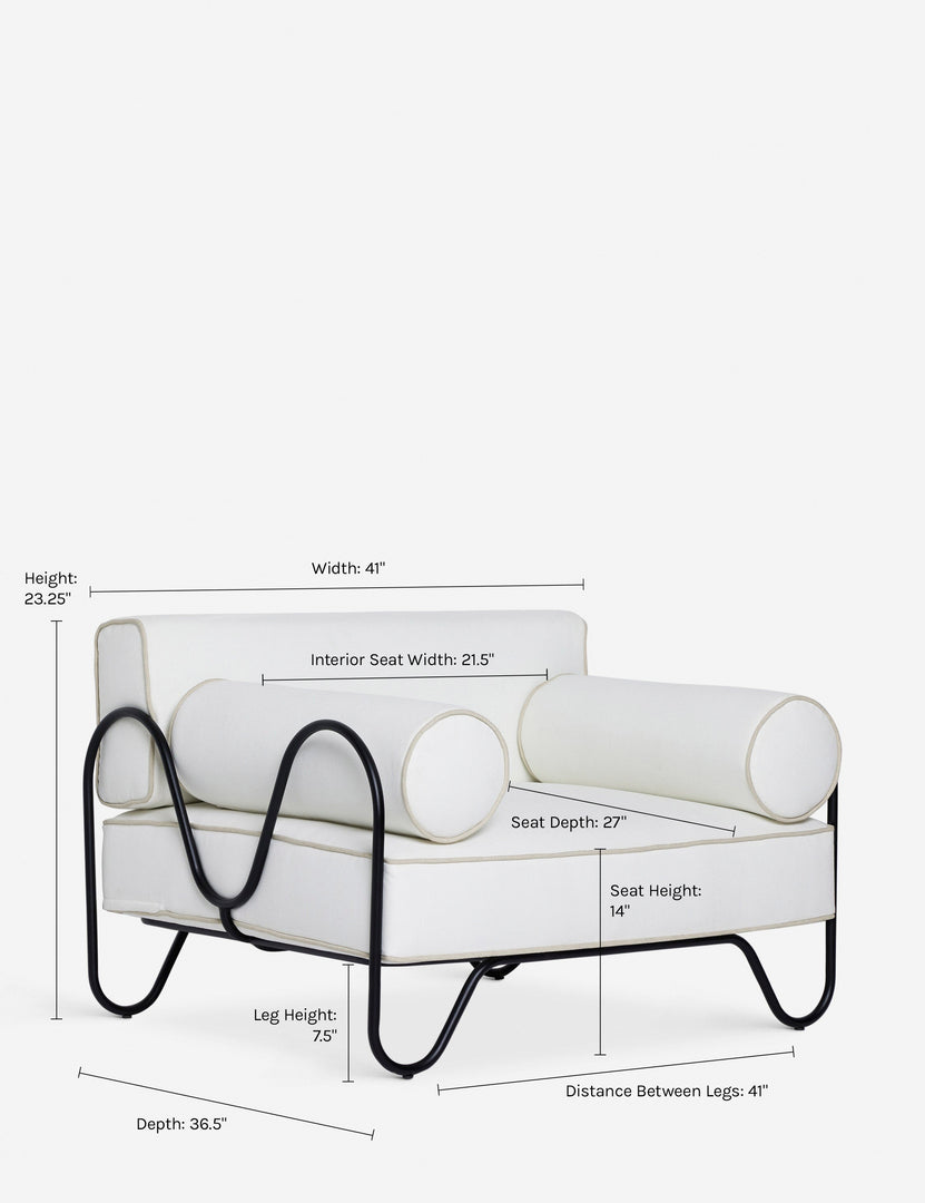 Make it a Sarah Sherman Samuel season with this exclusive outdoor collection. With boxy cushions and cylindrical arms on a shaped iron base, the Peggy accent offers an airy, artful look set for comfort. This outdoor lounge chair is from our long-running collaboration and features all the trademarks of Sarah's warm, edited style.