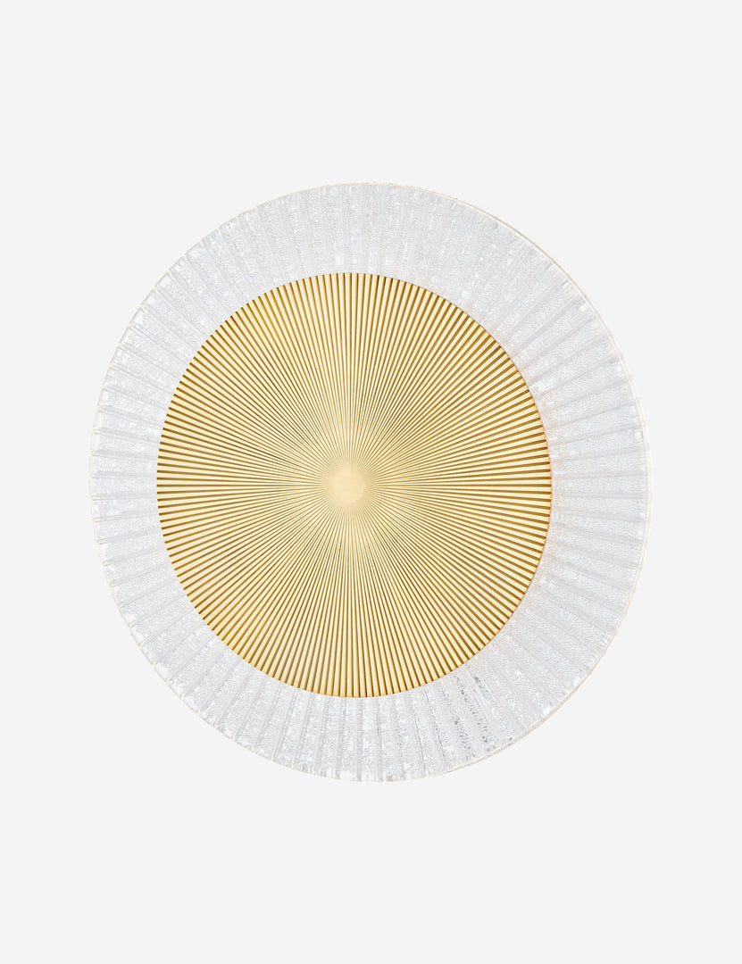 The Pellard flush mount light brings brilliance to lighting. The circular design features a rippled metal disk set against piastra ice glass in a visually stunning display. Style this low-profile fixture for warmth and sophistication overhead.