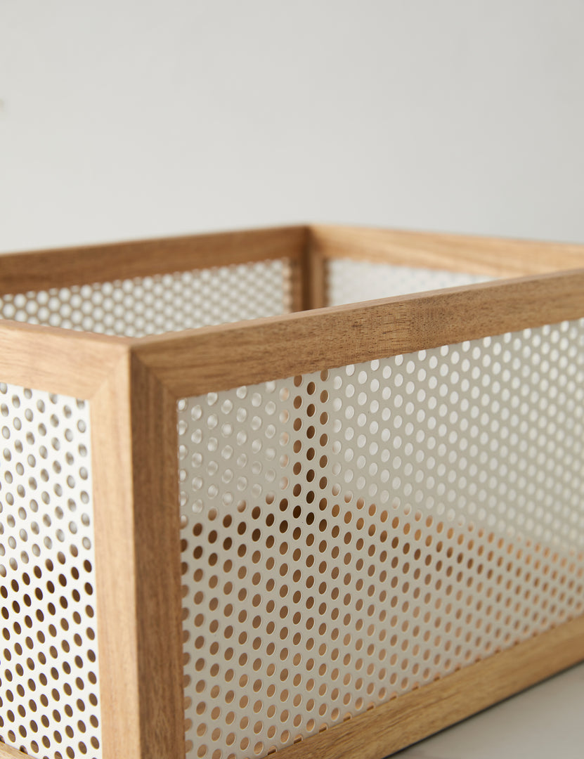 Mixed materials bring the perfect touch to this versatile basket. The sturdy yet airy design features a solid acacia frame with perforated metal sides ideal for corralling everything from small electronics to powder room amenities. Try styling in multiples for a tailored storage solution in a home office or kid's room.
