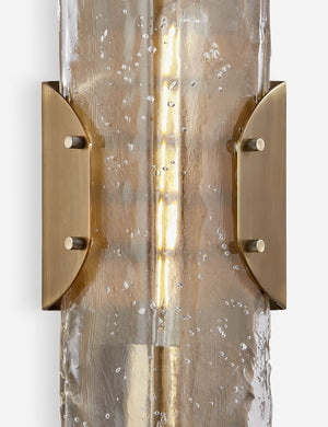 The Petrina sconce makes a sculptural statement with its cast glass form. Bubbled texture and warm glow create contrast against the streamlined mount. Use this wall lighting to bring illumination and polish to a hallway, nook, or powder room.