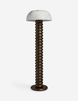 The Phaedra lamp brings a luxe look to bold forms. A marbleized resin dome casts a soft glow over a stacked ring base in burnished brass. Rich and dimensional, this floor lamp brings timeless warmth to collected spaces.