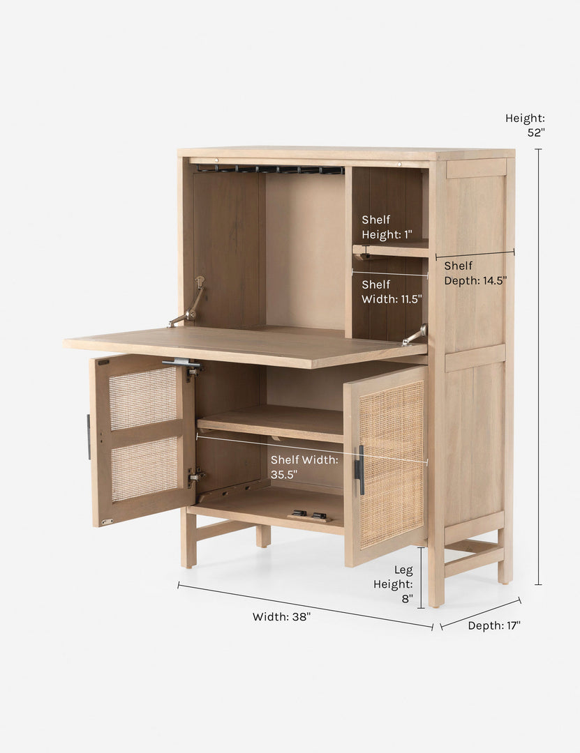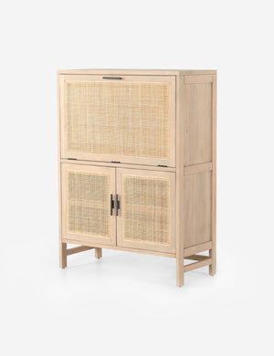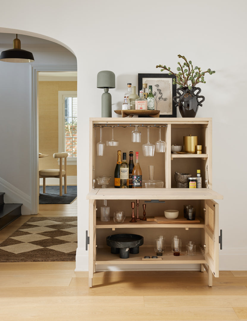 This bar cabinet is crafted from solid mango wood and woven cane paneling then finished with iron hardware for a sleek touch. A spacious interior provides storage for stemware and all your cocktail essentials, while the drop-down front makes the perfect surface for mixing. We love this piece as a chic addition for entertaining.