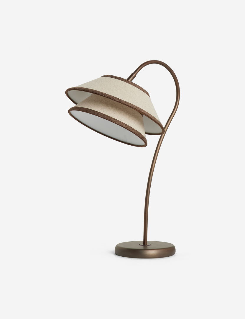 Ivory linen with a toffee trim brings a chic, tailored look to our Pittman table lamp. The tiered shade sits on an elegant curve, striking a sleek silhouette in the room—the perfect touch of table light to finish your space.