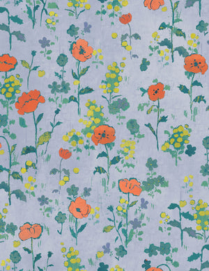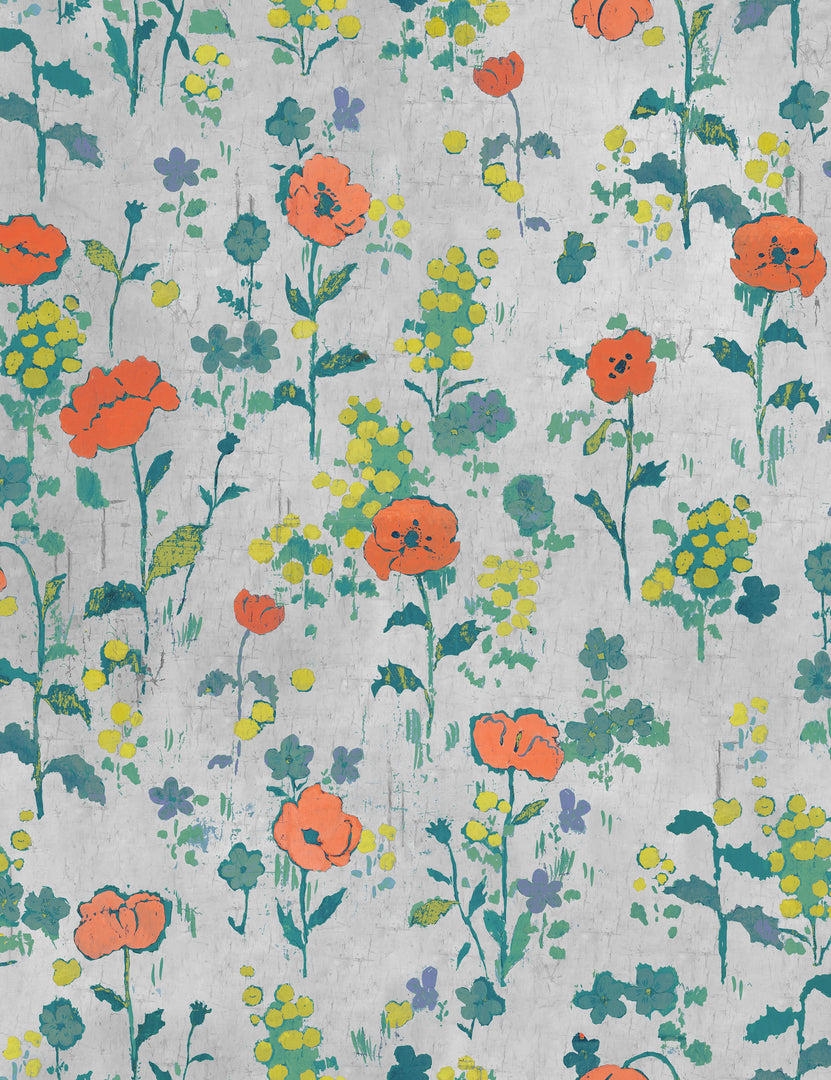Elevate your wall decor with the iconic work of textile artist, engraver, and painter Paule Marrot. This floral wallpaper design captures her simple, lyrical style with boldness and fidelity—offering artistry with a fresh yet enduring appeal. This floral print shows a scatter of orange poppies against a cool field in a beautiful play of color.