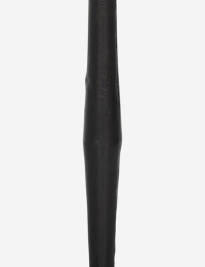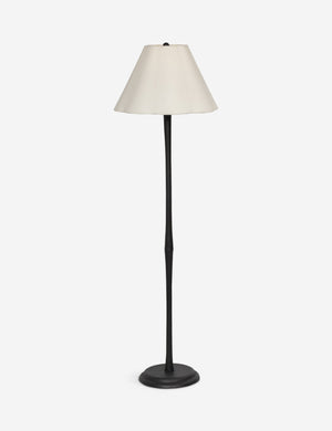 Slim in style, crisp with contrast. A black wrought iron base supports a cream linen shade, bringing tailored impact to this floor lamp. Place it beside a sofa or reading chair as a refined standing lamp with a modern edge.