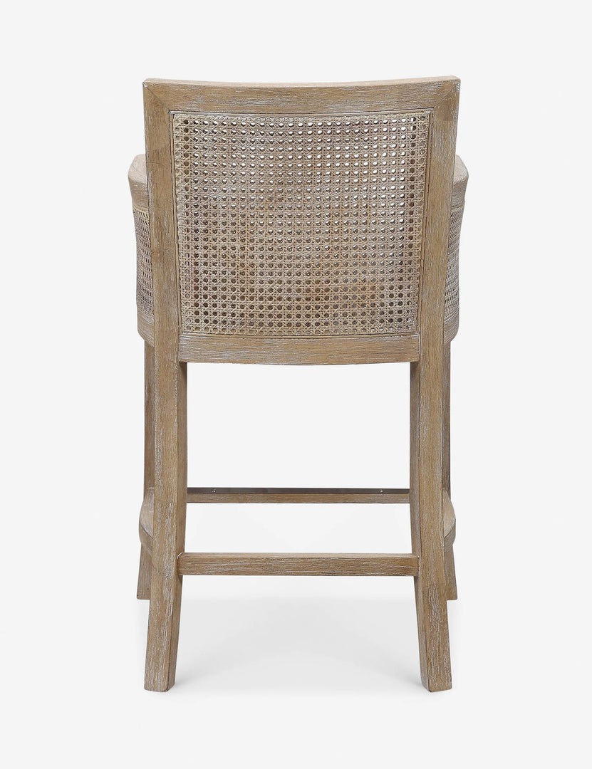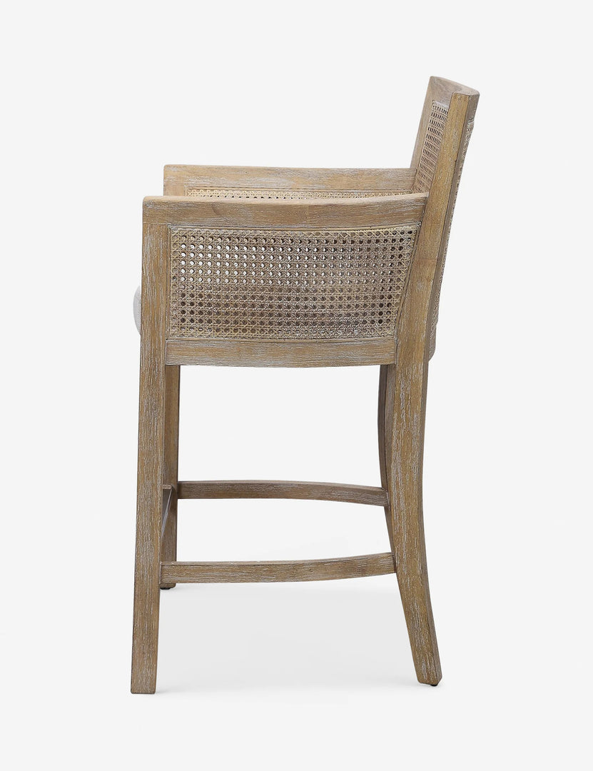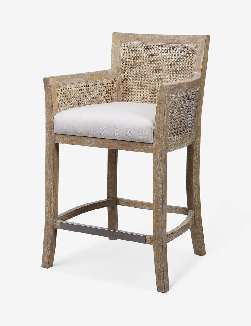 This counter-height stool offers a cozy, lived-in look thanks to the distressed finish on the wood frame, complimented by transitional open-weave wicker construction and contemporary off-white cushions.
