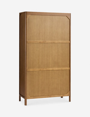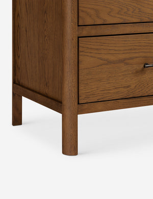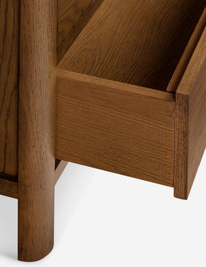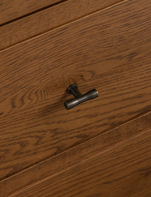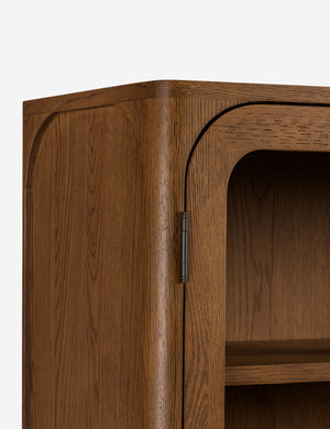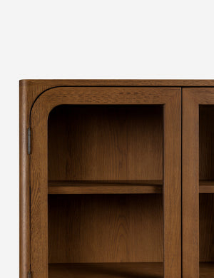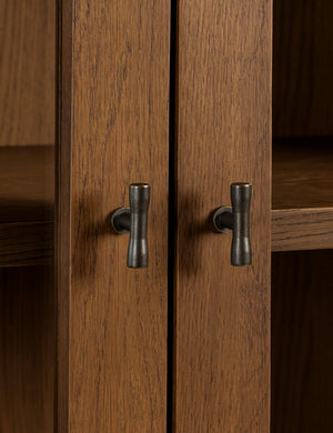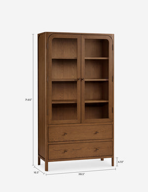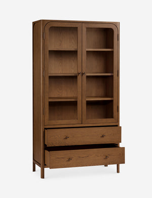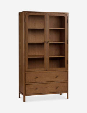 Clean lines and natural oak grain lend a simple elegance to the Ralston cabinet. The oak case is hand-finished in a walnut stain, offering a rich backdrop for display while two lower drawers keep essentials concealed. This tall cabinet's classic silhouette grounds a dining room, office, or living space with quiet warmth.