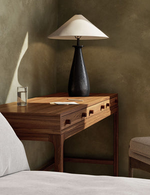 A sleek and sculptural design brings a modern tone to the Rayden lamp. The table lamp's textural aluminum body is topped with a tapered shade offering a dramatic silhouette with versatile styling appeal.