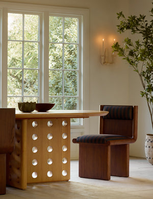 The Reika dining table features an oval top set on a perforated cross-base in a design that feels airy yet grounded. The clean rhythm of the circular cutouts adds a modern edge to the natural wood grain, creating a sculptural silhouette that anchors the room. This table is from our exclusive Sarah Sherman Samuel collaboration and features all the trademarks of her warm, edited style.