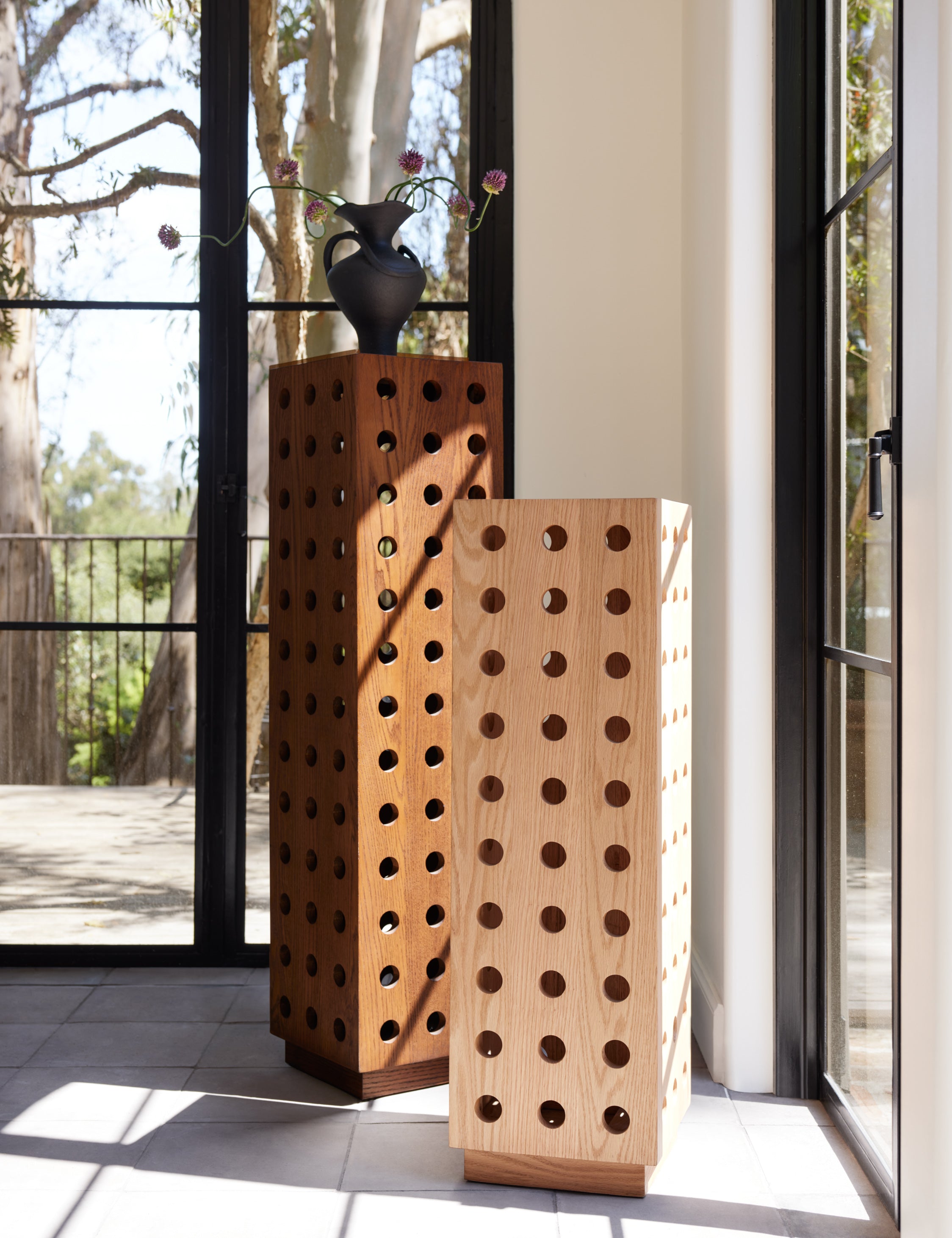 The Reika pedestal features a perforated silhouette with circular cutouts that bring a clean rhythm to its airy design. This sculptural piece works as a display stand, plant pedestal, or standalone accent. This piece is from our exclusive Sarah Sherman Samuel collaboration and features all the trademarks of her warm, edited style.