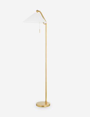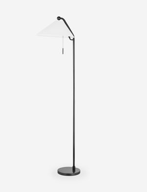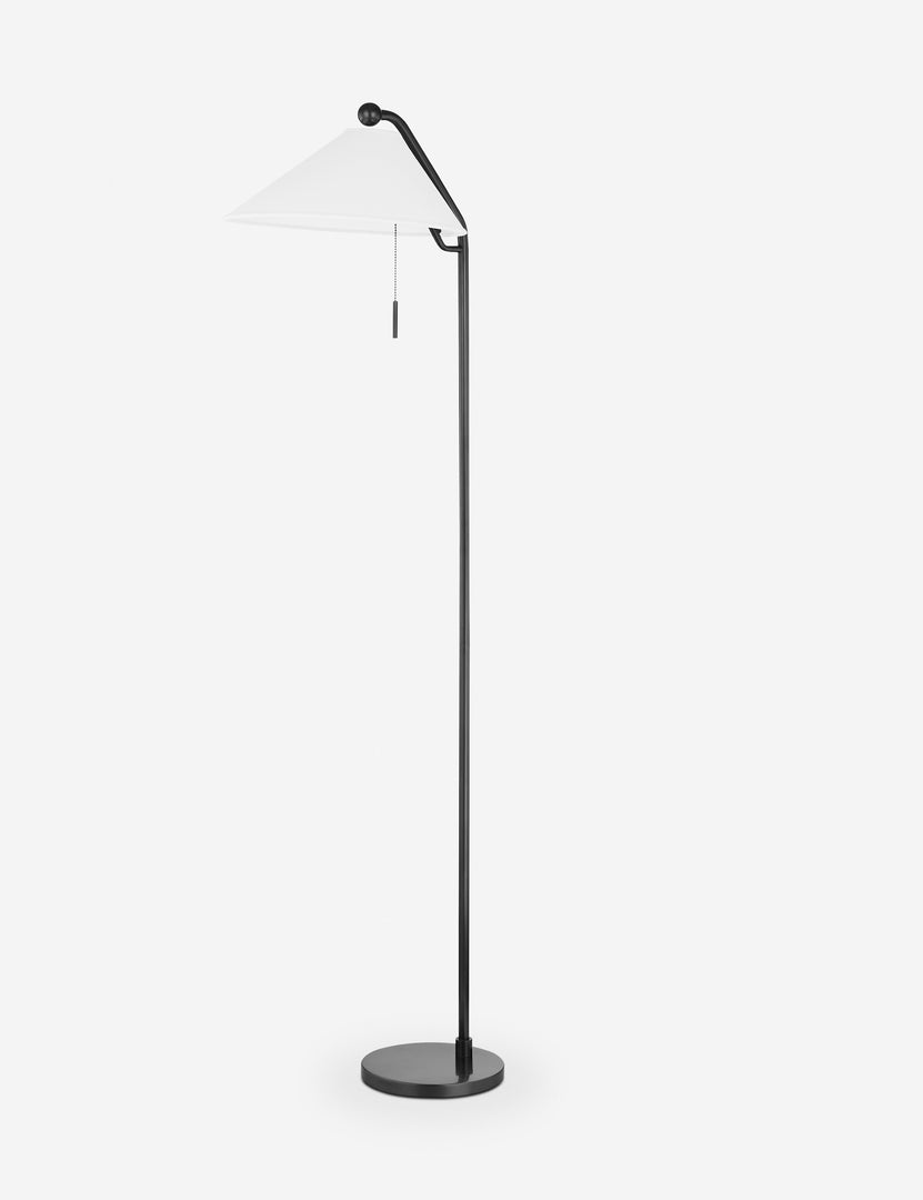 Complement this floor lamp's sleek, streamlined form with unique, eye-catching details. This lamp has a polished finish and features an asymmetrical white shade, a vintage-inspired pull chain, and a circular pole end. Curate this piece next to a reading chair in your bedroom or living space.