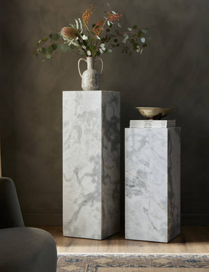 Defined by its clean form and natural veining, this marble plinth brings a refined edge to any space. We love it for transforming art, plants, or decorative objects into a statement moment. The design features levelers at the base for seamless placement in your home.