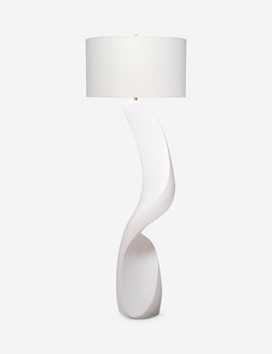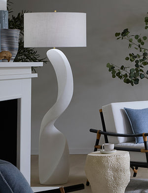 The Riella lamp captures sculptural drama with its sculptural ricestone base and clean white drum shade. The form feels dramatic yet organic, creating a striking silhouette that elevates minimalist, coastal, or modern interiors. Use this floor lamp as a bold anchor in a spacious living room or entry.