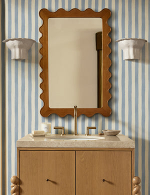 Wavy lines create a distinctive profile in this oak-framed mirror, clad in a honey finish to highlight the natural grain. This wooden mirror's undulating shape offers some signature flair to your look and lends it organic appeal. This piece is from our exclusive Sarah Sherman Samuel collaboration and features all the trademarks of her warm, edited style.