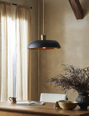 The Robinson pendant styles sleek appeal overhead with a low profile design. The metal dome shade is lined with gold leaf to cast a warm pool of light in the room. This pendant blends vintage notes with a modern sensibility that come together in a transitional design set to elevate any edit.
