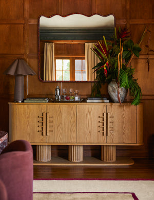 A clean design and wavy silhouette give this slim-framed mirror its chic appeal. With its broad profile, this mirror is perfect for adding depth and polish to a mantel or entryway table. This piece is from our exclusive Sarah Sherman Samuel collaboration and features all the trademarks of her warm, edited style.