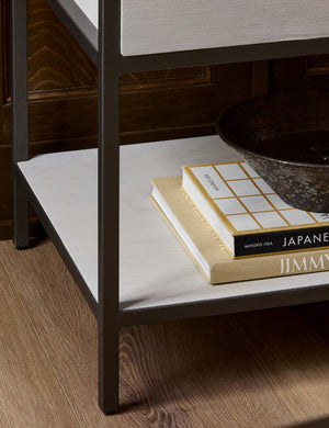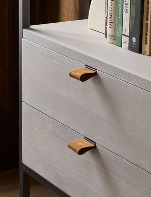 Keep your style grounded (and super organized) with this tall wooden bookcase. This bookshelf features elements of mid-century aesthetics and a mixed material construction pairing solid poplar with a slim iron base and top-grain leather drawer pulls.