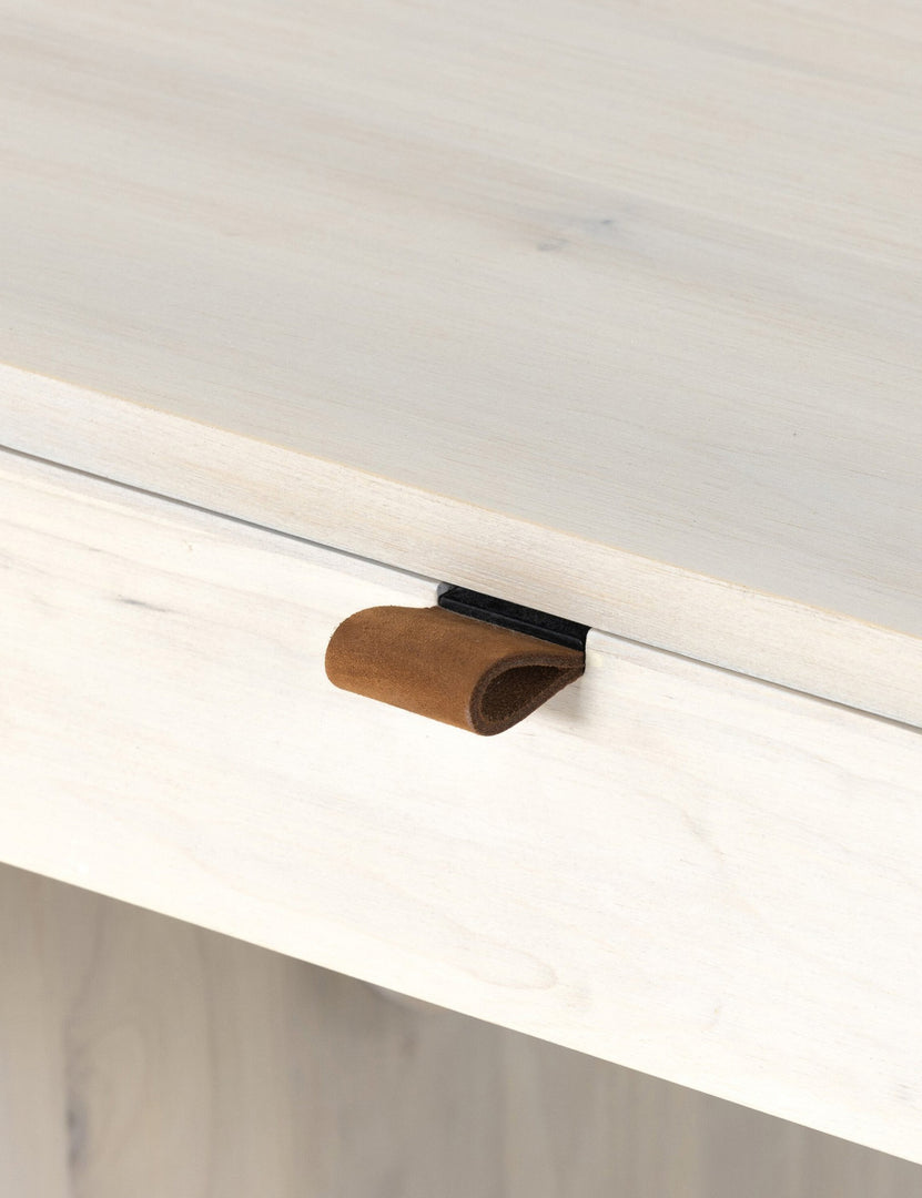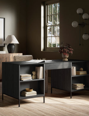 Upgrade your home office with this wooden executive office desk brimming with versatile storage appeal. Features elements of mid-century aesthetics like a clean-lined poplar construction, slim iron base, and top-grain leather drawer pulls.
