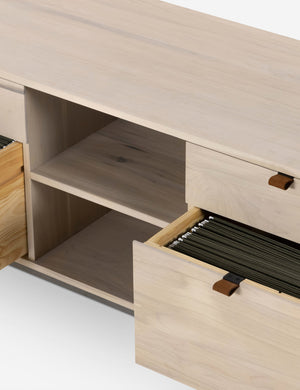 Keep your office style grounded (and super organized) with this wooden filing console. Features elements of mid-century aesthetics like a black wash, slim iron base, and top-grain leather drawer pulls.