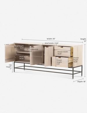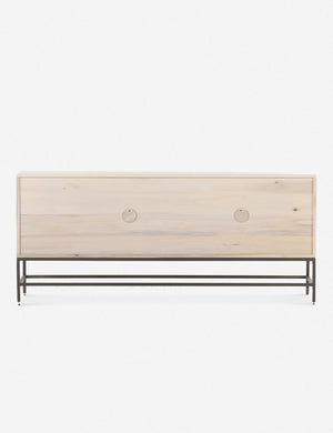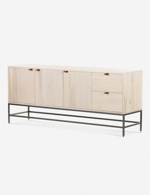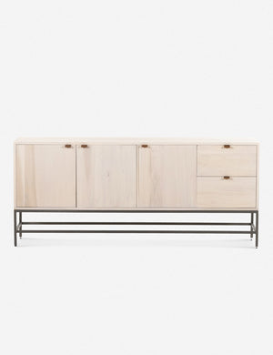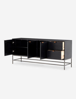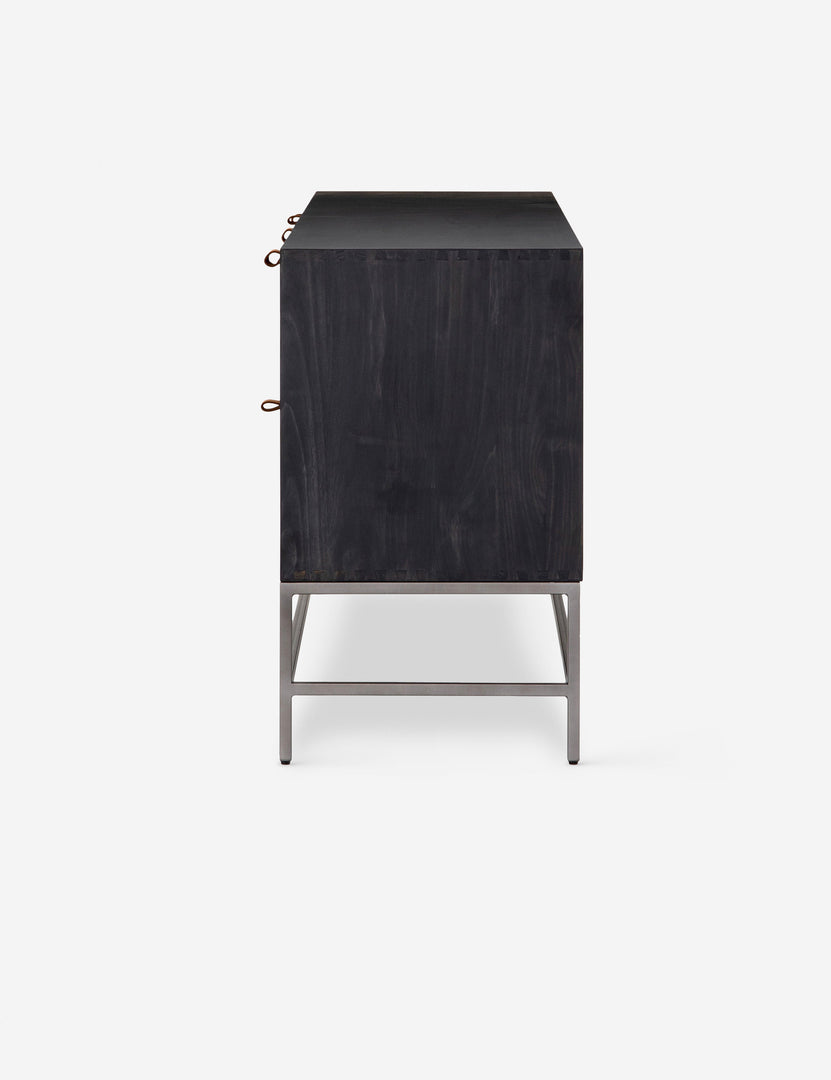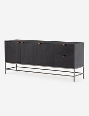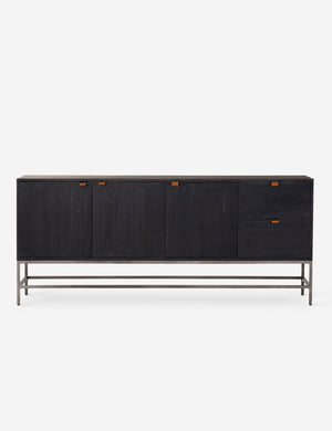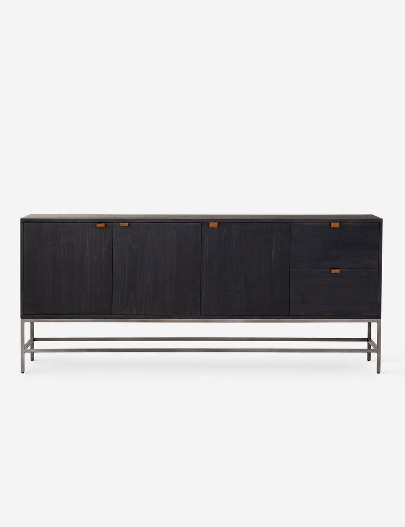 Keep your style grounded (and super organized) with this wooden sideboard cabinet. Features elements of mid-century aesthetics like a black wash, slim iron base, and top-grain leather pulls.
