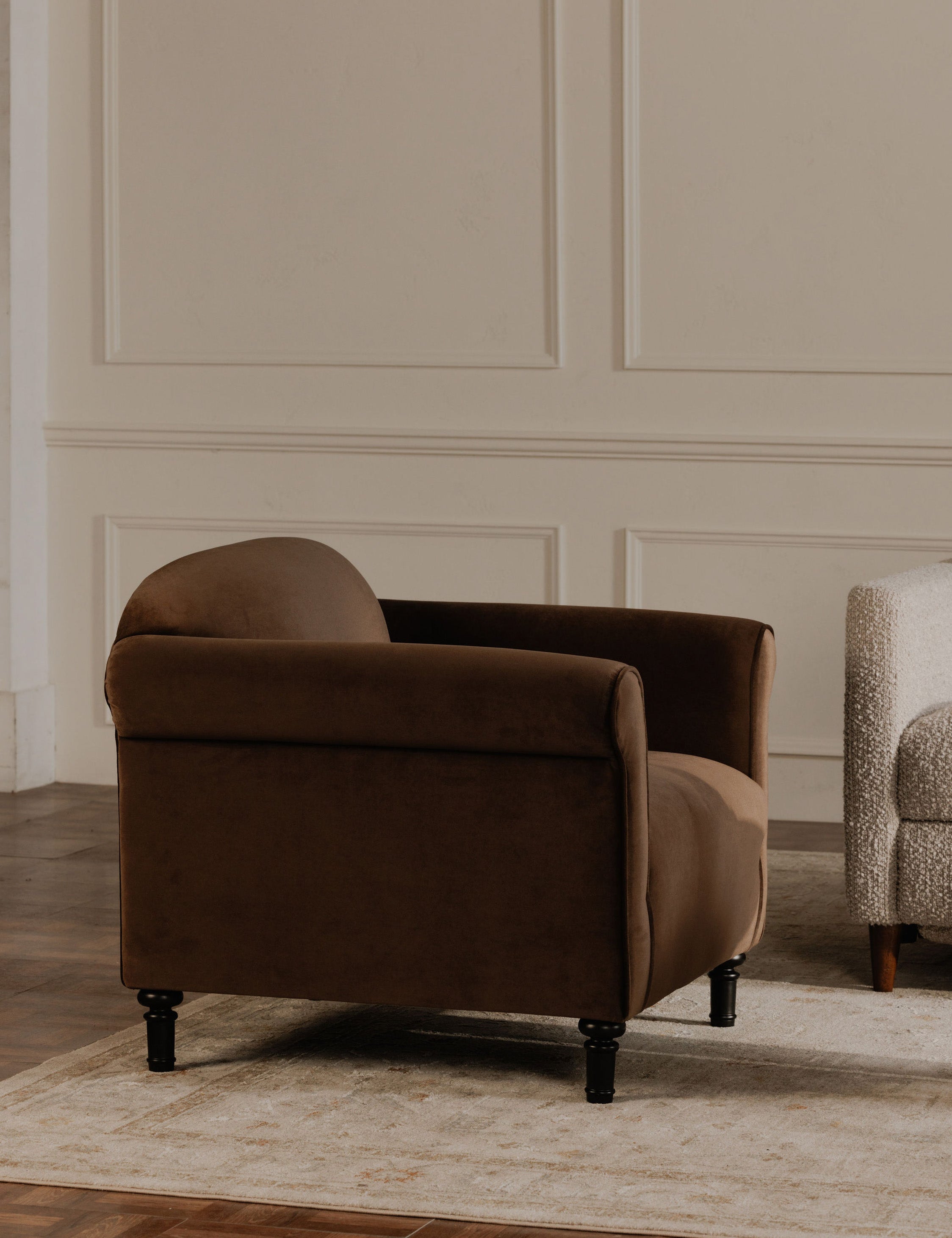 Sink into luxury. The Rosati chair features a classic rolled arm silhouette trimly tailored in a dense velvet-like faux mohair. The turned legs are crafted from solid birch, completing this timeless lounge chair with elegance in every touch.