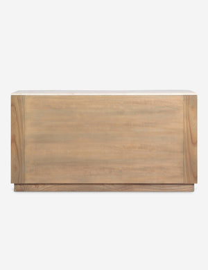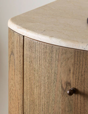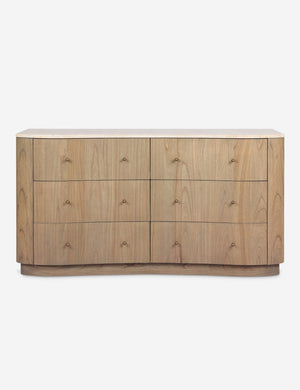 This wide dresser brings sculptural shape and organic texture to the bedroom. Crafted from warm-toned wood with a creamy marbled top, this piece offers generous storage in a soft, rounded silhouette. We love this dresser for grounding a modern space with refined storage.