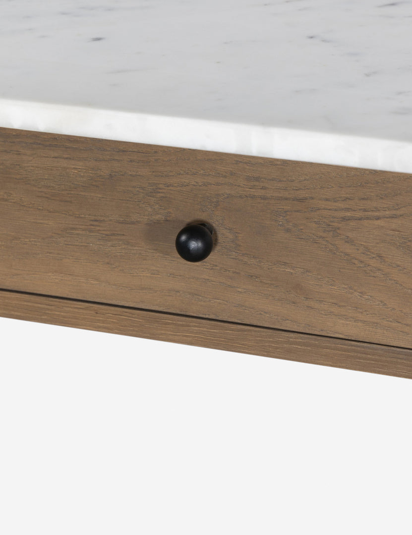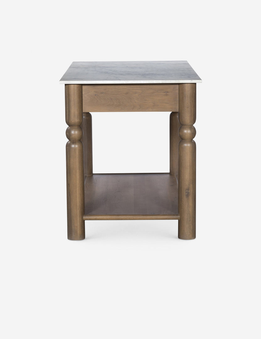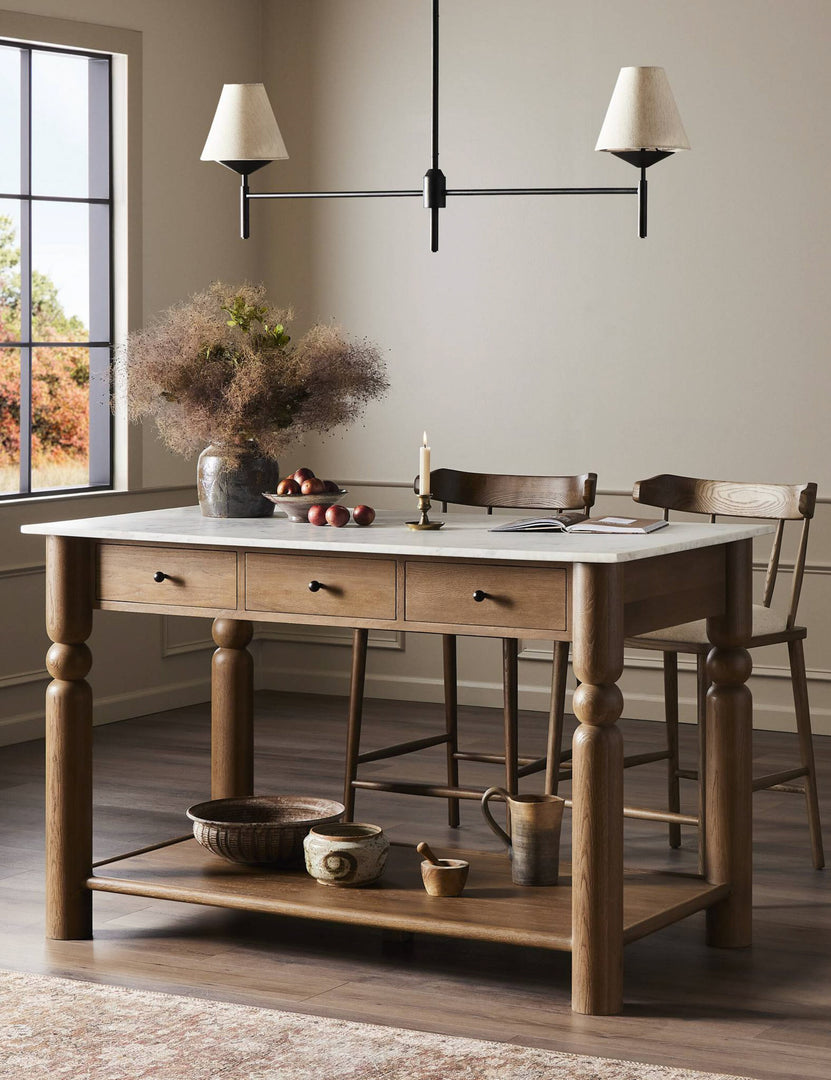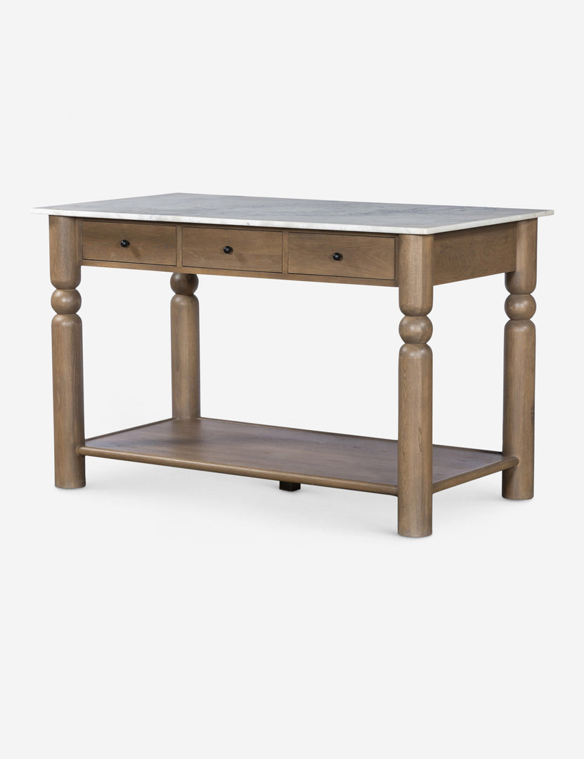 Looking for more from your kitchen? Don't settle for simple surface space—style it with a statement. This island transforms the flow of your room with a spot to sit for social cooking and casual meals or extra counter space for ambitious weekend bakes. The marble top and turned oak legs cut a timeless silhouette with three drawers and a lower shelf for ample kitchen storage.