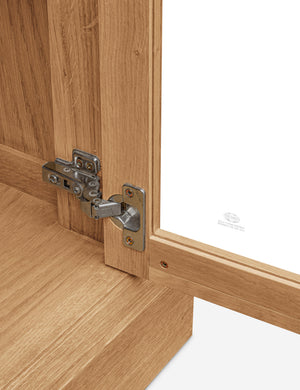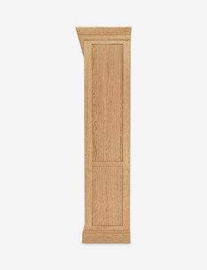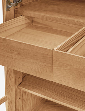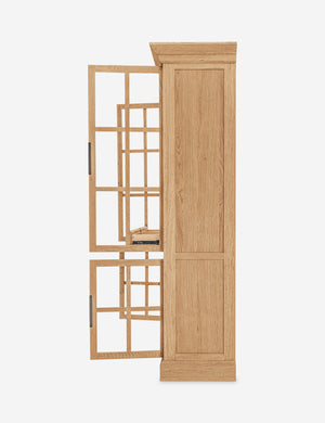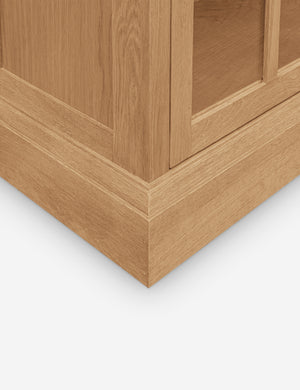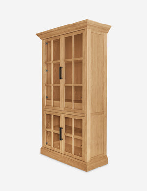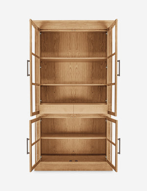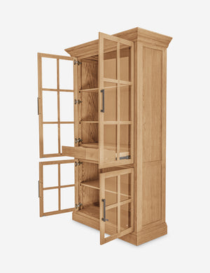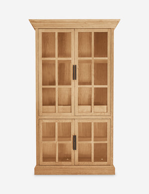 The Santos curio cabinet highlights traditional craftsmanship in a warm, wire-brushed oak finish. A tall frame with glass-front doors and molded details provides ample room for display, featuring interior drawers and cable management for added functionality. Standing over six feet, this tall cabinet brings an elegant storage piece to living or dining spaces.