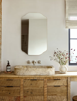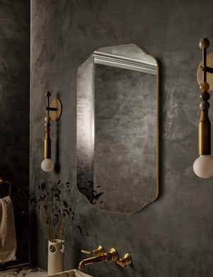 Functional decor gets a chic look in the Saoirse medicine cabinet. The shaped mirror offers a stylish silhouette, concealing the perfect touch of storage for a powder room or above your dresser or bedroom vanity.