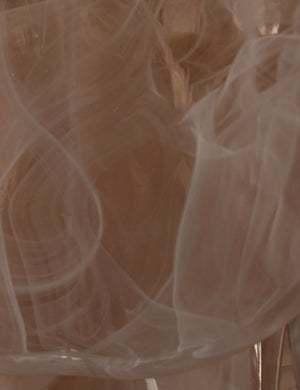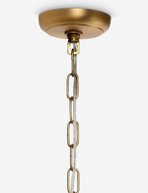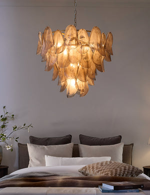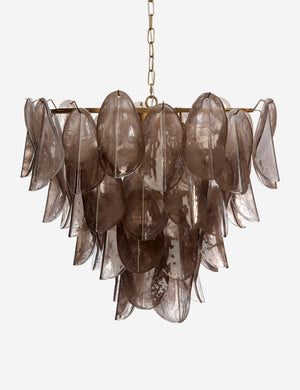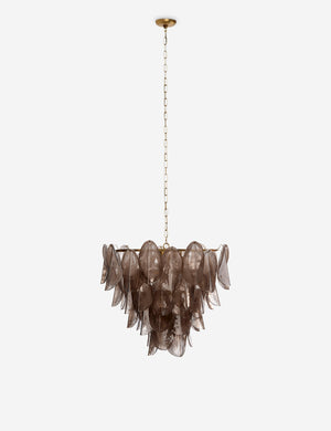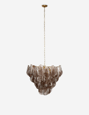 The Satima chandelier layers artisan-crafted glass petals in smoky tones with swirling details throughout. The organic shapes shimmer softly, whether lit or not, suspended from antiqued brass links for a warm, vintage finish. Style this chandelier above a dining table or in a grand entryway for a sculptural statement overhead.
