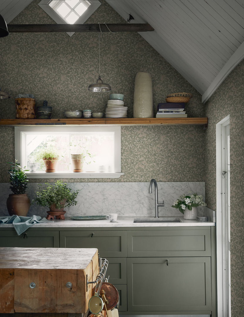 A perfect pairing of clematis and honeysuckle fills this floral wallpaper with a fresh leafy texture. We love the lush depth of this wallpaper for organic inspiration in a pattern-forward home design.