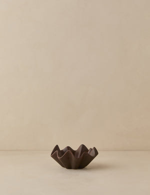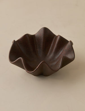 An organic ruffled form brings delicacy and lightness to the deep reactive brown glaze of this stoneware bowl. The addition to a modern table, this piece can double as a catchall on an entryway table or dresser.