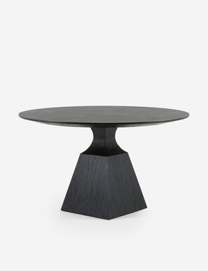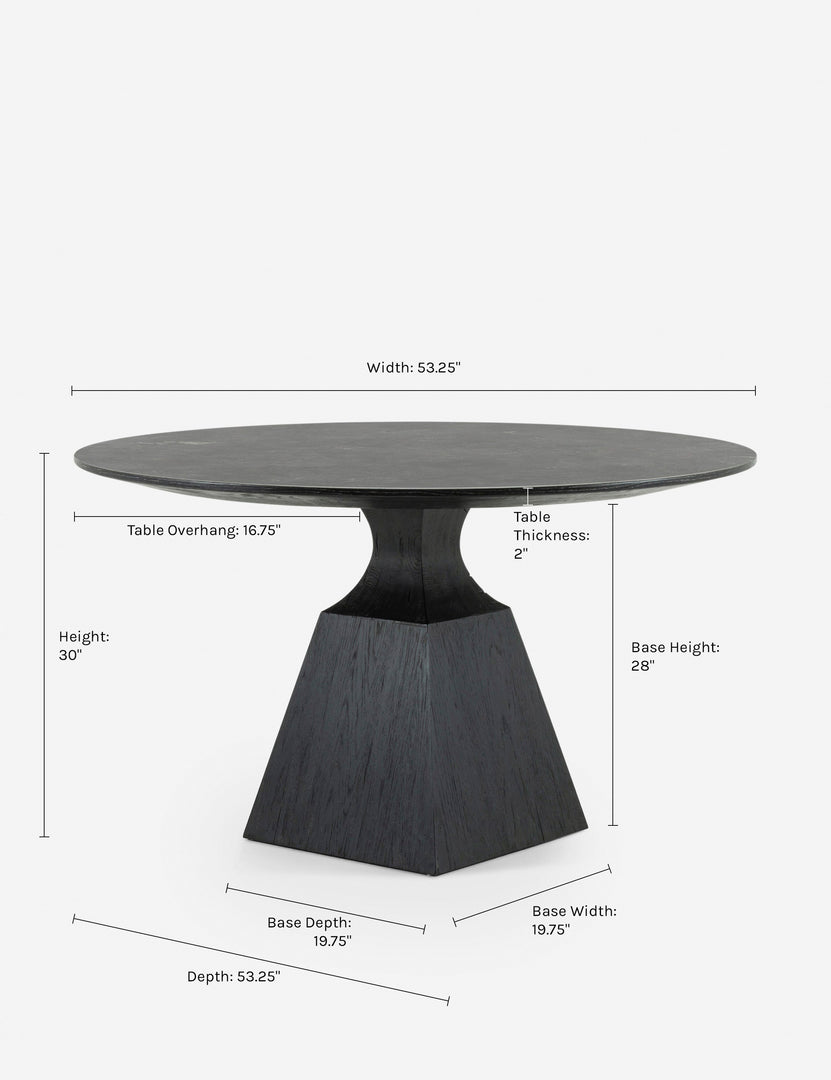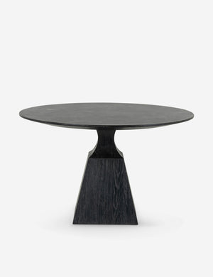 With a sculptural black oak base and beautiful bluestone tabletop, this round dining table is set for dramatic impact. The mixed materiality offers a refined touch perfect for a moody dining room look. A wire brushed finish of this dinner table showcases the textural grain of its oak construction.