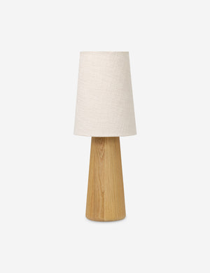 Modern minimal meets traditional. Scaled for tabletops, a conical wood base and boucle linen shade fashion this lamp with a grounding touch of warmth. A versatile table light with a designer feel, perfect for a sideboard, dresser, or console.