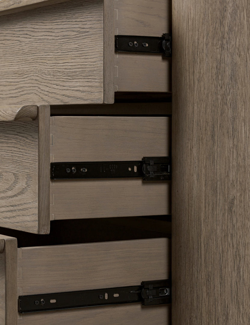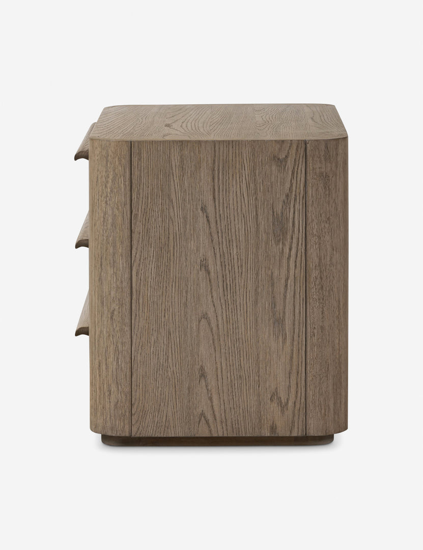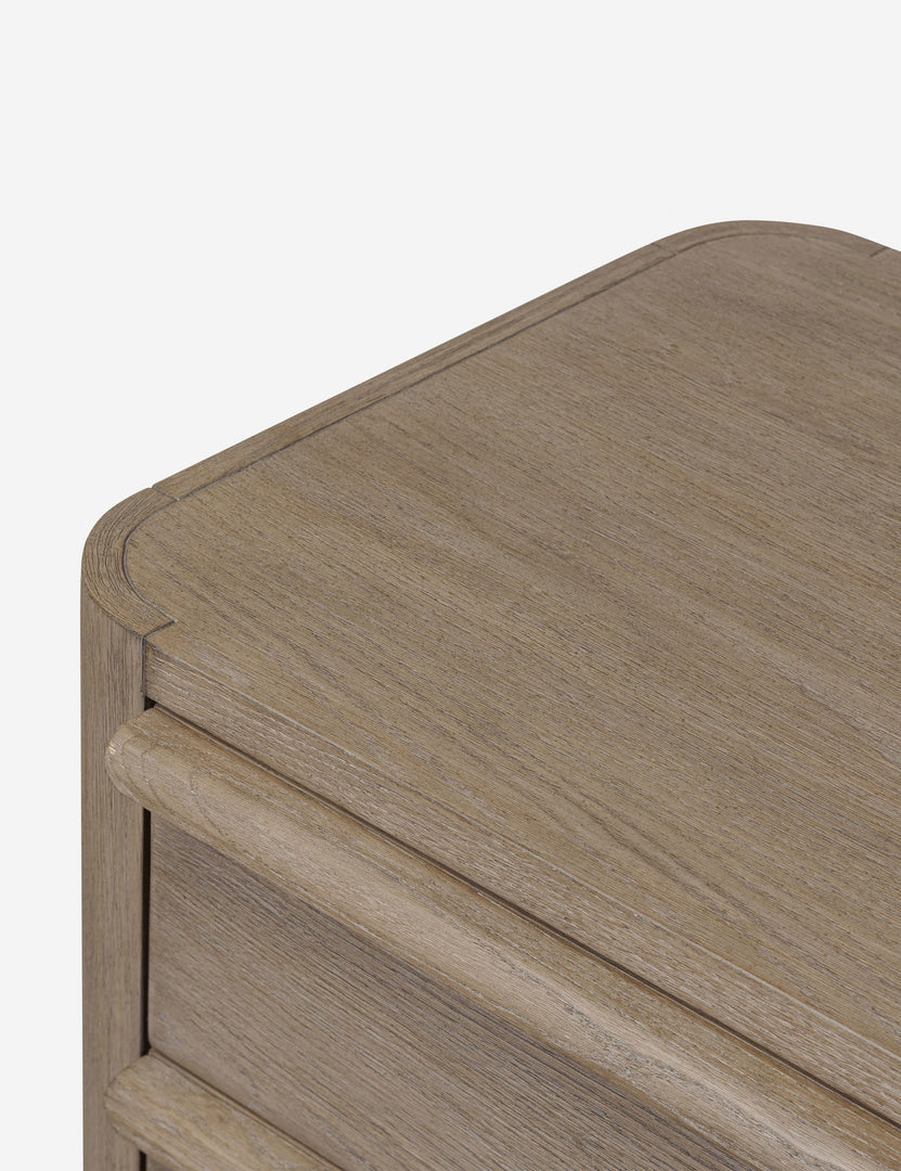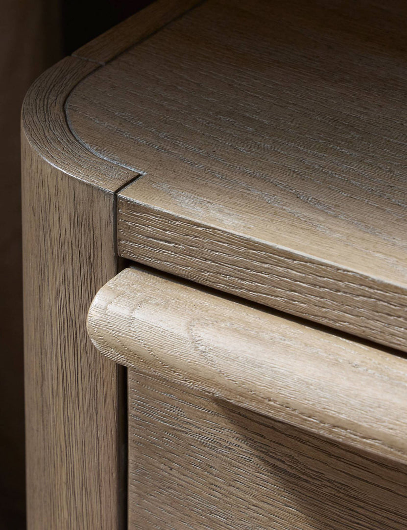 A study in soft impact, the Silvano nightstand features rounded corners and wide, smooth-gliding drawers for a refined take on bedside storage. Crafted with natural oak in a warm grey finish, this large nightstand adds quiet texture and seamless storage to your bedroom.
